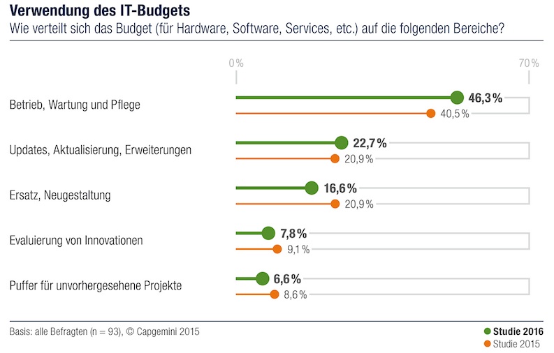 Abb. 2: Bildquelle Capgemini, Verwendung des IT-Budgets, Vergleich 2015 mit 2016 (Prognose)