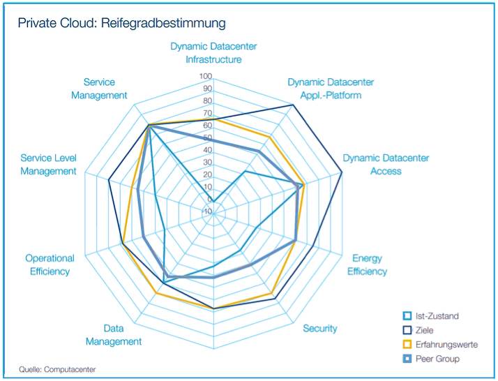 Nach dem Assessment vergleichen Experten des Anbieters den Ist-Zustand, die Zielsetzung und typischen Erfahrungswerte für die Reifegrade miteinander (siehe Bild unten). Auf einen Blick wird der Handlungsbedarf für den Weg zum bedarfsgerechten Cloud-Computing leichter erkennbar. Ein umfangreiches Maßnahmenpaket wird dabei laut Anbieter in einer Roadmap zeitlich, thematisch sowie individuell für jeden Fall strukturiert angeboten.