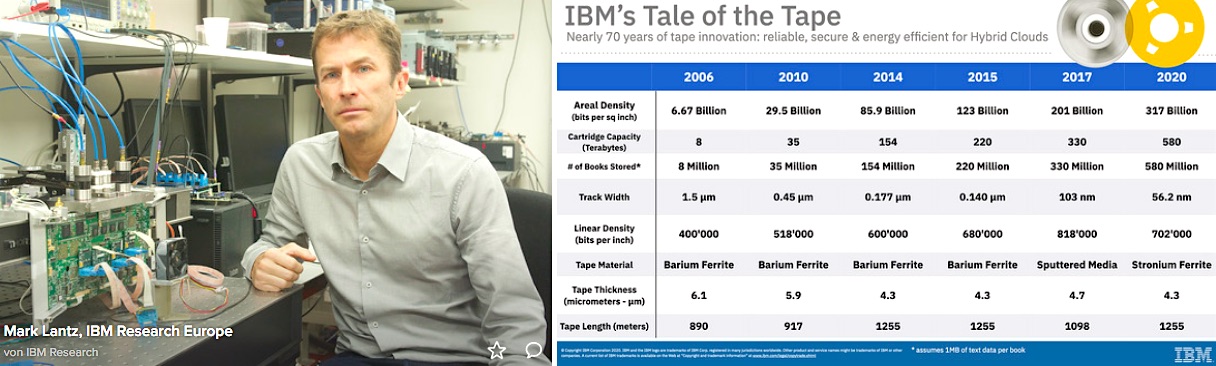 **Hintergrund: IBM Research Europe in Zürich und FujiFilm demonstrierten am 15. Dez. 2020 einen neuen Rekord-Aufzeichnungswert von 317 Gb/in2 bei Tape-Media-Technologien. Die Unternehmen konnten damit eine zukünftig mögliche Kapazität von 580 TB pro Cartridge unter Verwendung von Strontium-Ferrit (SrFe) mit magnetischen Partikeln darstellen. ** Das Ergebnis soll in etwa der 48-fachen Kapazität von LTO-8 Bändern entsprechen.