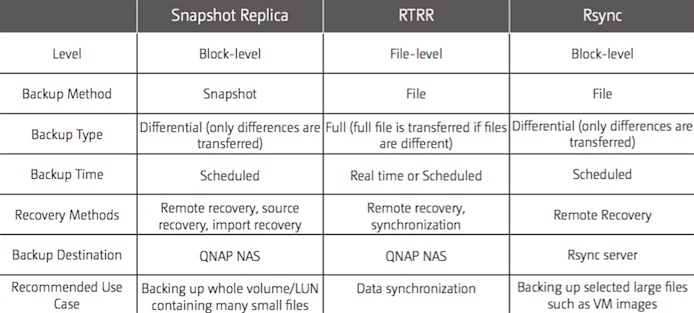 Abb. 1: Hybrid Backup Sync and Snapshot Comparison (Bildquelle: QNAP, NAS Solution Whitepaper / Hybrid Backup Sync is a backup utility for QTS that offers Real-time Remote Replication (RTRR) and RSync. Comparison between RTRR, Rsync, and Snapshot Replica).