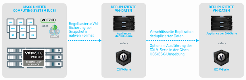 DXi Deduplizierung: Die Deduplizierungsappliances DXi4700 und DXi6900 wurden für den Einsatz von Deduplizierung und Backup in UCS-Umgebungen zertifiziert. Die DXi4700 ermöglicht die Datensicherung für Rechenzentren und remote oder virtuelle Umgebungen. Sie umfasst laut Hersteller eine Verschlüsselung auf Militärniveau und ist in die Cloud erweiterbar. Die DXi6900 wurde entwickelt, um auch hohen Anforderungen an die Datensicherung im Rahmen von Skalierbarkeit, Performance und Sicherheit. zu begegnen. Die virtuellen Deduplizierungsappliances der Quantum DXi V-Serie ermöglichen es, Daten-Deduplizierung als virtuelle Maschine für VMware auf UCS-Hardware zu implementieren.