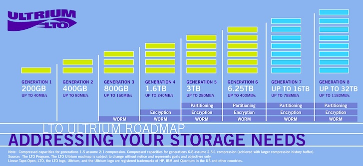 Die Roadmap des Ultrium LTO Programms (1997 von HP, IBM, Quantum in's Leben gerufen) finden Sie am Textende. Hier der Link zur Webseite: