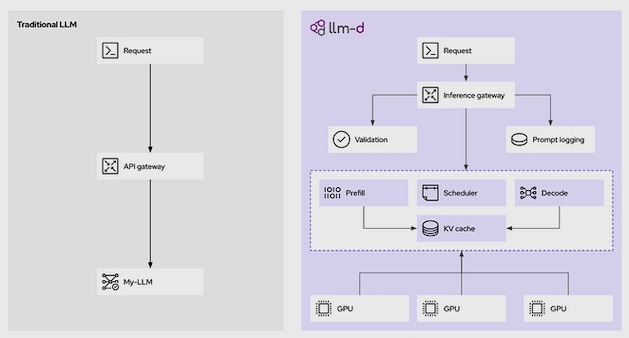 Um Verantwortliche dabei zu unterstützen, das Maximum aus ihren hochwertigen Hardwarebeschleunigern herauszuholen, führt Red Hat OpenShift AI 3 die allgemeine Verfügbarkeit von llm-d ein, eine native Ausführung von LLMs auf Kubernetes. llm-d ermöglicht verteilte Inferenz, nutzt den Ansatz der Kubernetes-Orchestrierung und die Performance von vLLM in Kombination mit zentralen Open-Source-Technologien wie Kubernetes Gateway API Inference Extension, NVIDIA Dynamo Low Latency Data Transfer Library (NIXL) sowie DeepEP Mixture of Experts (MoE) Communication Library.