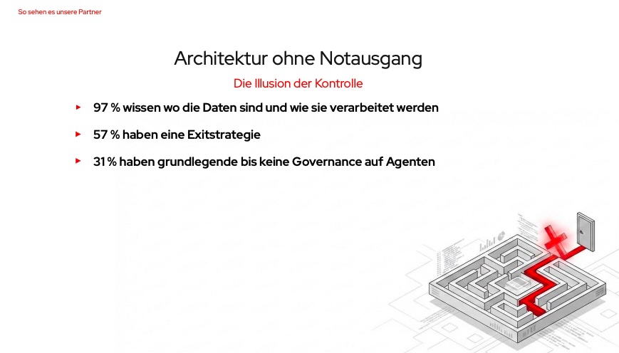 „Nur 57 % der befragten deutschen Unternehmen haben danach eine Exit-Strategie, falls ihr primärer KI-Anbieter den Zugang einschränkt. Gleichzeitig sagen 37 % dieser Unternehmen, dass ein Wechsel moderate bis erhebliche Auswirkungen auf die Geschäftskontinuität hätte. Weitere Ergebnisse: