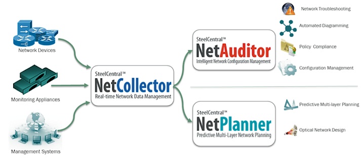 - SteelCentral NetCollector: Reduziert Zeit und Aufwand für die manuelle Erfassung und den Abgleich von Netzwerkdaten; lässt sich mit Riverbed SteelHead integrieren, so dass Konfigurations- und Betriebsdaten automatisch erkannt und gespeichert, sowie Konfigurationen auf Fehler und Compliance-Verstöße überprüft werden können.