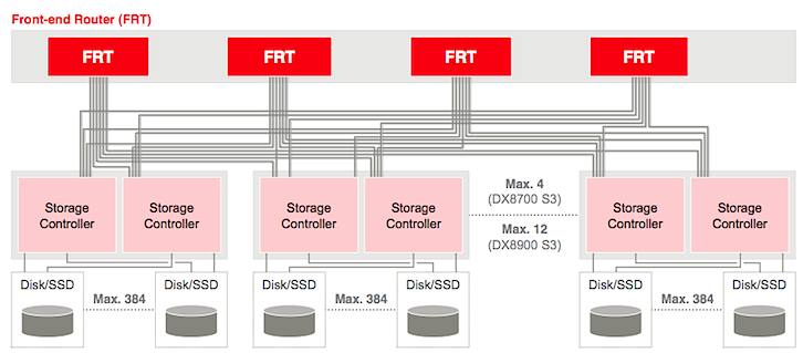 Die ETERNUS DX8900 S3 ist geeignet zur Speichernetzwerk-basierten Datenkonsolidierung von virtualisierten (Cloud) Rechenzentren. Die Quad-Star-Architektur mit 2 bis 24 Controllern unterstützt bis zu 4.608 Festplatten bei 4.0 Mio. IOPS (4k). Jeder Controller verfügt über 4 PCIe (3rd. gen) lines, die mit sog. front-end Routern (FRT) verbunden sind. Pro Controller-Paar sind 384 Drives unterstützt (max. 12 Controller-Paare).