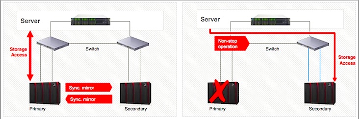 Der Failover auf das verbleibende System oder die sekundäre Lokation erfolgt bei dieser Lösung selbstätig und transparent für Hosts und deren Anwendungen; die Applikationsszugriffe werden in Echtzeit aufrechterhalten. Alle Systeme der Hochverfügbarkeitsumgebung sind Aktiv-Aktiv während des normalen Betriebs produktiv einsetzbar.
