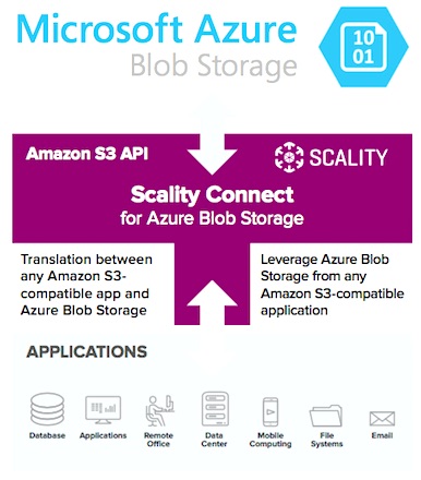 Scality Connect für Azure Blob Storage übersetzt Amazon S3 API Calls automatisch in Azure Blob Storage API Calls und erlaubt die sofortige transparente Nutzung von Amazon S3 Anwendungen in Azure Blob Storage.