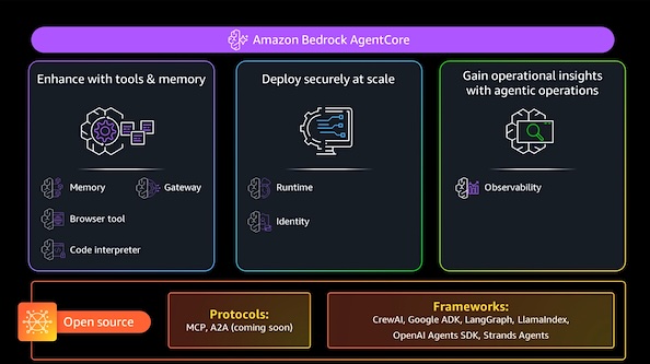 Flexibilität: Entwickler können beliebige Frameworks wie CrewAI, LangGraph und OpenAI Agents SDK und Modelle nutzen – sowohl von Amazon Bedrock als auch externe Modelle wie OpenAI und Gemini. Die Services können einzeln oder in Kombination eingesetzt werden.