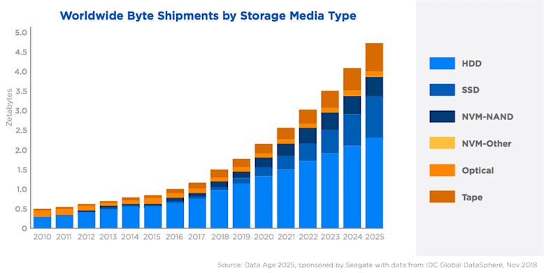 Abb. 1: Worldwide Byte Shipments by Storage Media Type (Bildquelle: DATA AGE 2015 - The Digitization of the World From Edge to Core / David Reinsel, John Gantz, John Rending, November 2018 / IDC White Paper – #US44413318, Sponsored by Seagate, Figure 10). Link > https://www.seagate.com/de/de/our-story/data-age-2025/