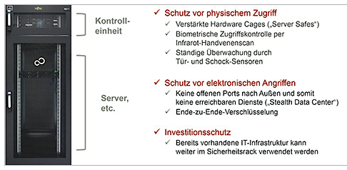 Die neuartige Sicherheitsrack-Lösung verhindert wie ein Banksafe mit seinem verstärkten Gehäuse physische Angriffe auf die IT-Systeme, wie etwa den Diebstahl von Festplatten oder den Einbau von Spionage-Hardware. Eine integrierte Steuereinheit überwacht das Rack mittels Sensoren und öffnet die Türen nur, wenn sich Administratoren authentifizieren können.