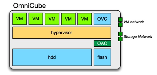 Es bedeutet, dass alle Infrastruktur-Komponenten nicht nur in einem Gehäuse stecken, sondern innerhalb eines physischen Knoten integriert sind – dem sog. „OmniCube“. Die hyper-konvergierte Lösung umfasst Server-und Storage-Ressourcen, zusammen mit einer Reihe von erweiterten Funktionen für die Verwaltung und dem Schutz virtueller Maschinen und beinhaltet eine spezielle Beschleuniger-Karte, um die Leistung und Effizienz der Datenspeicherung bei Write-Befehlen zu optimieren.
