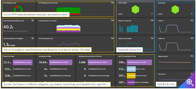 Abb.: SLI-based Performance Dashboard with insights into each Test Step as well as visibility into process and infrastructure metrics (Bildquelle: Dynatrace Tutorial- Guide to automated SRE-driven performance engineering).
