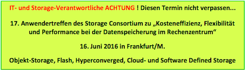 Falls Sie als Anwenderunternehmen an weiteren Informationen zum Thema Software Definierte Infrastrukturen interessiert sind, dürfen wir Sie hiermit auf unser 17. Anwendertreffen des Storage Consortium am 16. Juni in Frankfurt/M. einladen. Sie erhalten dort praxisnahe Informationen aus 1. Hand und treffen erfahrende Kollegen-innen zum fachlichen Austausch. Weitere Informationen unter: 17. Anwendertagung des Storage Consortium