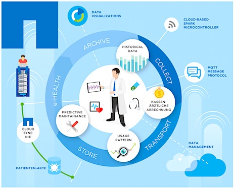 Führen wir uns dazu vor Augen, wie die gesundheitliche Versorgung in Zukunft aussehen könnte: Patientendaten werden über IoT-fähige Endgeräte in Echtzeit erfasst und auf einer zentralen Plattform gesammelt, sodass der behandelnde Arzt – ob Haus- oder Facharzt, ob in der Praxis oder im Krankenhaus – jederzeit Zugriff auf alle wichtigen Informationen sowie den aktuellen Gesundheitszustand des Patienten hat. Basierend darauf kann er dann geeignete Therapiemaßnahmen einleiten. Zusätzlich werten selbstlernende Algorithmen die Datensätze aus und suchen nach Krankheitsmustern, geben Handlungsempfehlungen oder schlagen im Verdachtsfall frühzeitig Alarm.