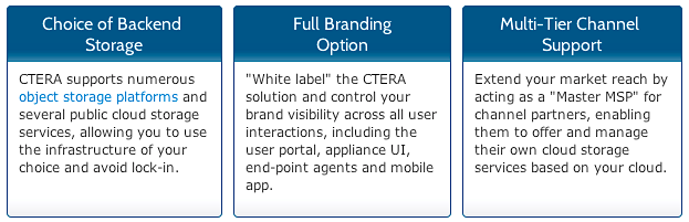 White-Label-fähige Storage-Services von CTERA: sie ermöglichen CSPs den Betrieb von Storage-as-a-Service-Angeboten für Cloud-basiertes Endpunkt-Backup, sicheres File Sync and Share sowie Remote-verwaltete Storage Gateways unter eigener Marke.