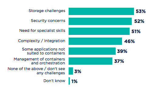 Abb. 1: Potential challenges in using containers. Quelle: suse.com Research Report / August 2017. SDI, Containers and DevOps - Cloud Adoption. Trends Driving IT Transformation (figure 10).