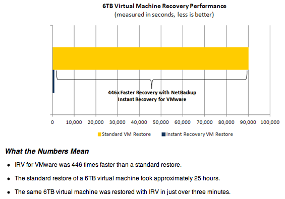 Virtuelle VMware VSphere Maschinen lassen sich - im Vergleich mit traditionellen Ansätzen - rund 400-mal schneller direkt vom Backup wiederherstellen (Quelle: Symantec, ESG). NetBackup Instant Recovery für VMware Umgebungen startet virtuelle Maschinen direkt aus der NetBackup–Umgebung: während der Wiederherstellung in VSphere sind sie zu 100 Prozent verfügbar.