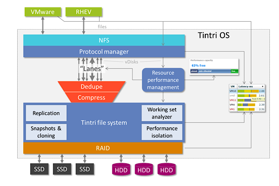 Zum Hintergrund: Auf LUN- und Laufwerksebene betriebene Legacy-Speicherarchitekturen entsprechen integrationsseitig nicht immer den Anforderungen von virtualisierten Systemen, gerade in Bezug transparente Verwaltung, Leistung und Integrationsfähigkeit. Tintri VMstore wurde speziell für virtualisierte Umgebungen entwickelt und kann als Hypervisor-neutrale Speicherplattform verschiedene gemischte Workloads (Server, VDI, Entwicklung, Test) simultan pro "Tintri VMstore" unterstützen. Gleichzeitig lässt sich VMware vSphere und Red Hat Enterprise Virtualization auf einem VMstore betreiben.