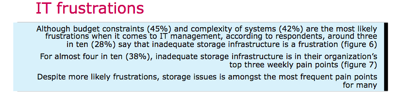 Zum Hintergrund: Unter dem Titel „Storage: limitations, frustrations and coping with future needs“ hat Red Hat Storage kürzlich die Research-Ergebnisse einer unter 500 europäischen IT-(Storage) Entscheidungsträgern durchgeführten Umfrage bekannt gegeben (1). Untersucht wurde, wie inadequate Storage-Infrastrukturen und Ressourcen die Unternehmens-IT negativ beeinflussen. Die Auswertung deckt sich übrigens mit den Erfahrungen aus diversen Kundengesprächen, in denen es um die Reduzierung bzw. Vereinfachung der Komplexität im Data- und Storage Management Bereich geht. Dies wurde aktuell auch im Rahmen einer Diskussion mit AMADEUS IT diese Woche während der VMworld in Barcelona deutlich, bei dem u.a. die zentrale Bedeutung eines pro-aktiven Verfügbarkeits-Managements der IT-Infrastrukturkomponenten Anwenderseitig betont wurde.