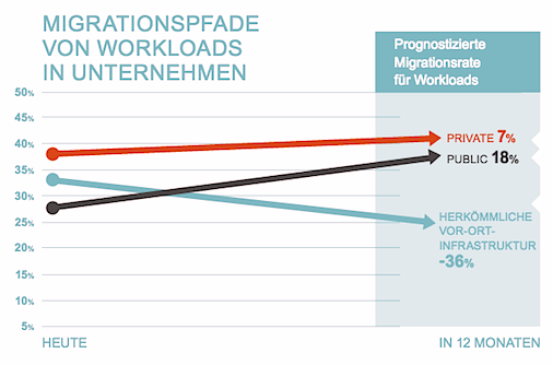 38 Prozent der Workloads werden in einer Private Cloud betrieben, 28 Prozent in einer Public Cloud. Laut der Studie werden sich diese Zahlen in den kommenden zwölf Monaten voraussichtlich um sieben beziehungsweise 18 Prozent erhöhen.