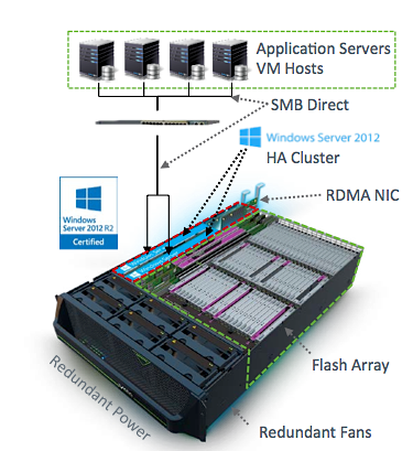 Microsoft hat seinen Windows Storage Server 2012 R2 erweitert; vor allem gibt es nun die Möglichkeit, externen Speicher quasi wie lokalen Speicher anzubinden. Das neue Server Message Block Direkt (SMB)-Protokoll über Remote Direct Memory Access (RDMA) ist eine Alternative zu herkömmlichen SANs, wenngleich nicht so skalierbar. Interne Tests von Microsoft zeigen, dass SMB Direct den CPU-Overhead um bis zu 30 Prozent reduzieren kann; dabei kann der Storage mittels nativer Windows Server Management-Tools verwaltet werden (TCO). SQL Server als Enterprise-Class- Datenbank erzielt mit WFA laut Hersteller bis zu zwei Mal die Schreib- und eine bis zu 50 Prozent höhere Leseleistung im Vergleich zu einem All-Flash-Arrays, das über Fibre Channel angebunden wurde.
