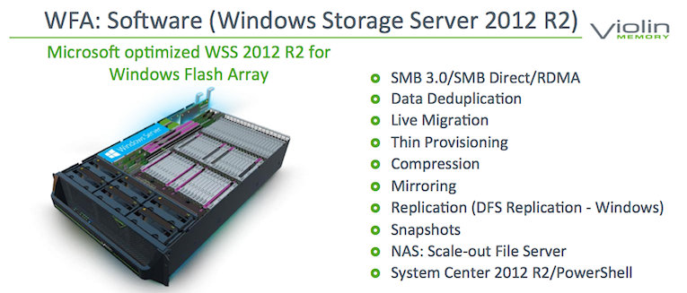 WFA als integrierte Kombination von Windows Storage Server 2012 R2 und Violine Storage Hard-und Software stellt alle Storage-Funktionen des Windows Storage Server 2012 R2 - integriert im Violin Array - wie Thin Provisioning, Deduplizierung oder Verschlüsselung zusammen mit Thin Snapshots und kontinuierlicher Verfügbarkeit (Windows Cluster Failover) zur Verfügung.