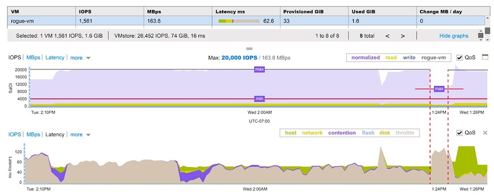 Die Software unterstützt nach Herstellerangaben über 100.000 VMs für eine zentrale Ansicht und Überwachung. Administratoren können dynamische Sammlungen von VMs anhand von Gruppendefinitionen und Richtlinien verwalten. Gruppen können unterschiedliche VMstores, Hypervisortypen und Standorte sein. Anders als Speicherlösungen, mit der die Servicequalität auf LUN- oder Volume-Ebene festlegt wird, erlaubt es das neue Release, minimale und maximale IOPS für jede einzelne VM festzulegen, indem die Schwellenwerte erhöht oder verringert werden. VM-Latenzzeiten werden auf demselben Monitor visualisiert, sodass der Administrator über die Auswirkungen der Änderungen informiert bleibt.