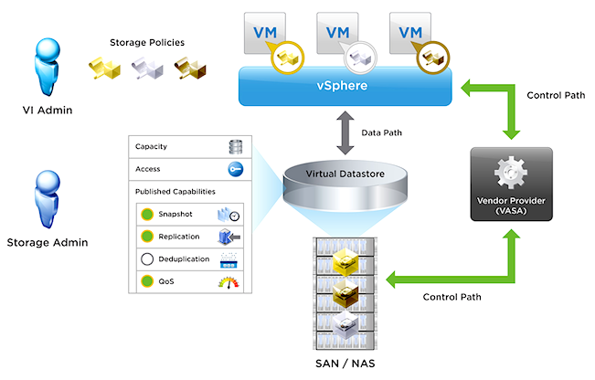 Storage-Arrays erhalten mit dieser SDS-Komponente einen direkten Zugang zu virtuellen Maschinen. VMware vSphere Virtual Volumes ist ein Set aus Storage APIs, das eine vertiefte Integration zwischen dem Storage und VMware vSphere auf der Ebene von virtuellen Maschinen ermöglicht (analog zu VASA, dass weiterhin verfügbar ist). Auf diese Weise kann das Storage-Array dynamisch Kapazitäten und Datendienste für jede virtuelle Maschine bereitstellen. Storage-Arrays mit VMware vSphere Virtual Volumes lassen sich über eine gemeinsame Plattform verwalten.