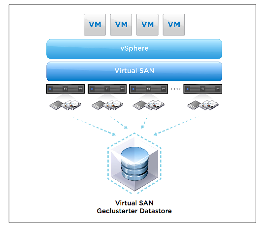 VMware Virtual SAN ist in VMware vSphere integriert und arbeitet als Hypervisor-konvergente Storagelösung für virtuelle Maschinen. Die Software verfügt über Funktionen zum richtlinienbasierten Storage-Management und verschiebt die Speicherverwaltung von Gerät zur Anwendung, indem Administratoren laut Hersteller "innerhalb von Minuten Storage für Applikationen bereitstellen können". Einige Vorteile: einfacheres Management durch die Integration in den VMware-Stack, höhere Performance sowie Skalierbarkeit inkl. Optionen zur Senkung der Gesamtbetriebskosten. VMware Virtual SAN soll demnach beim Management ca. ein Drittel der Betriebskosten (OPEX) gegenüber traditionellem Storage aufweisen.