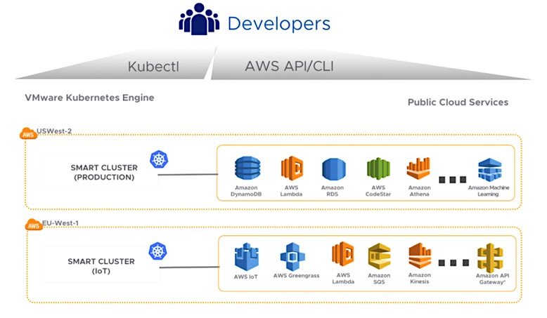 Abb. 1: VMware Kubernetes Engine turnkey access to public cloud services and application building blocks like Amazon Machine Learning, AWS Lambda, AWS Greengrass, and AWS IoT (Bildquelle: VMware Kubernetes Engine, Document DEPLOY MODERN APPS WITH KUBERNETES AS A SERVICE)