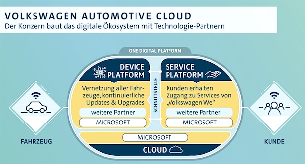 Volkswagen plant nach vorliegenden Information über die Volkswagen Automotive Cloud die Verknüpfung von Fahrzeug, cloudbasierter Plattform und kundenorientierten Diensten aller Marken, wie beispielsweise dem „Volkswagen We“-Ökosystem, erheblich zu optimieren. Mit dem Aufbau der Volkswagen Automotive Cloud soll Volkswagen künftig in der Lage sein, digitale Dienste auf seine gesamte Flotte auszuweiten. Darüber hinaus können neue Dienste und Lösungen für das Kundenerlebnis im Fahrzeug, im Bereich Telematik und für einen sicheren Datenaustausch zwischen Fahrzeug und Cloud effizient entwickelt und schnell eingesetzt werden.