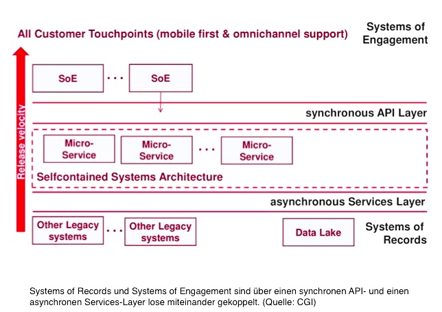 Systems of Records und Systems of Engagement entkoppeln: Bei der Umsetzung des ersten Schritts stellen Unternehmen fest, dass die Systems of Engagement in der Regel mit den transaktionalen Systemen der Systems of Records gekoppelt sind. Die SoE sind damit von den Release-Zyklen der SoR abhängig und können nicht so flexibel agieren, wie es eigentlich wünschenswert wäre. Die IT-Abteilung sollte daher eine Service-Architektur – beispielsweise auf Basis von Microservices – zwischen den SoE und den SoR einziehen, die beide Systemwelten lose anstatt starr miteinander verbindet. Durch diese Entkopplung werden die Systems of Engagement ihrer eigentlichen Aufgabe gerecht: mit Hilfe neuer Methoden wie beispielsweise dem Design Thinking werden die innovativen Geschäftsfelder, Produkte und Services eines Unternehmens unterstützt und die Digitale Transformation wird gefördert.