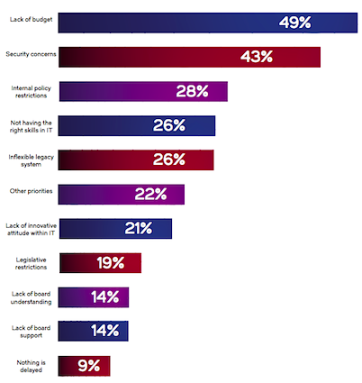 - Digitale Transformation stellt für viele Unternehmen eine der obersten Prioritäten dar. IT-Experten müssen immer wieder Kompromisse eingehen, die sie daran hindern, neue Technologien und Ansätze einzuführen. 87 Prozent der Befragten adaptieren derzeit neue Strategien für die Digitale Transformation. Während 94 Prozent der Studienteilnehmer sagen, dass ihre CIOs diese Strategien als entscheidend für die Erreichung der Geschäftsziele betrachten, gaben 79 Prozent an, die Strategien aus Budget-Gründen (49 Prozent), wegen Sicherheitsbedenken (43 Prozent), aus mangelnder Flexibilität des aktuellen Systems (26 Prozent) oder wegen zeitaufwendigen veralteten Systemen (22 Prozent), nicht entsprechend umsetzen können. Laut 29 Prozent der Befragten verhindern die begrenzten Kapazitäten älterer Technologien, dass Unternehmen auf unmittelbare geschäftliche Anforderungen reagieren, geschweige denn innovative Lösungen für die Zukunft zulassen können.