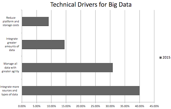 Zum Hintergrund: Bei der Diskussion über Daten im Unternehmen fehlt es häufig an echten / belastbaren Daten, aber es besteht definitiv kein Mangel an unspezifischen Adjektiven. Meist ist im Zusammenhang mit Big Data von „riesigen“, „überwältigenden“ oder „ausufernden“ Datenmengen die Rede, was natürlich nicht immer der Realität entspricht. Eine Umfrage von NewVantage Partners (1) stellt den aktuellen Stand der Informationstechnologie in ein numerische Licht: In den Jahren 2014 bis 2016 hat sich danach die Zahl der Fortune 1000-Unternehmen, die in 2017 mehr als $50 MM für Dateninitiativen auszugeben beabsichtigen, von 5 Prozent auf 25 Prozent verfünffacht; dies gilt insbesondere für die Integration von Datenquellen- und Typen (s.a. Abb. 1 unten).